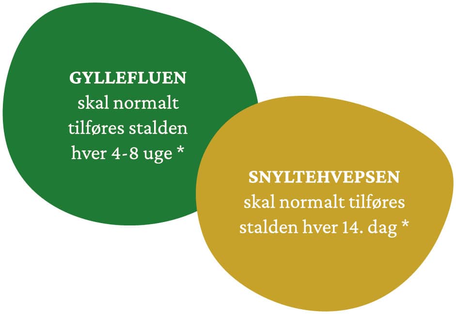 Om du bør anvende gyllefluer eller snyltehvepse afhænger af dit staldsystem, men fælles for dem begge, er at de blot skal tilføres staldens miljø med jævne intervaller for at få god effekt mod de fluer, du gerne vil bekæmpe.