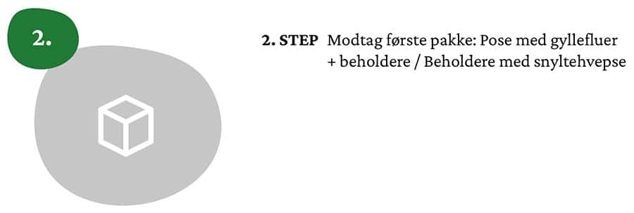 Når du starter med et abonnement, er der en etableringsperiode på 6-8 uger for gyllefluer og 4-6 uger for snyltehvepse. Du får derfor indledningsvis 3 leveringer med 2 ugers mellemrum. Herefter gælder ovenstående beregning.