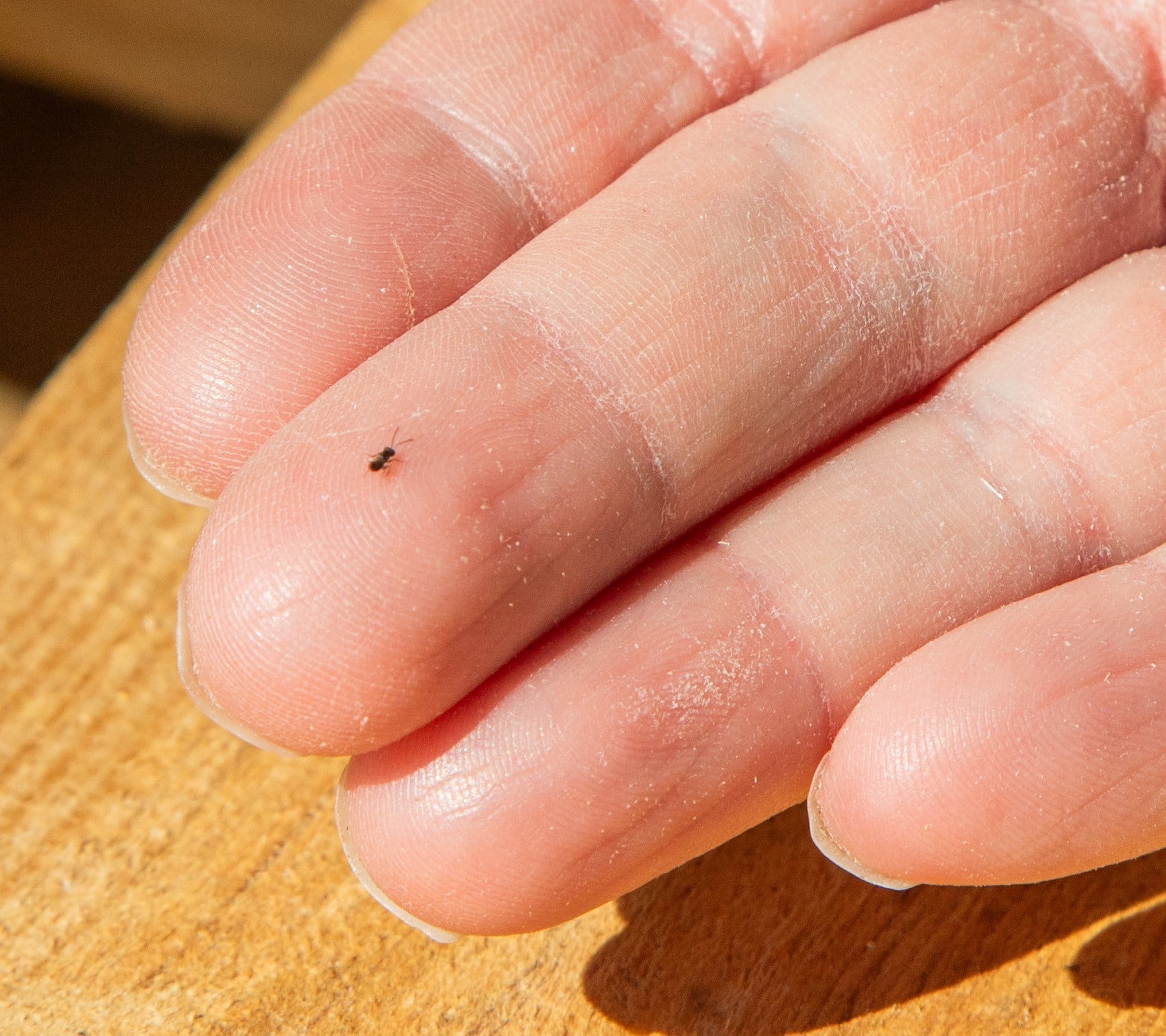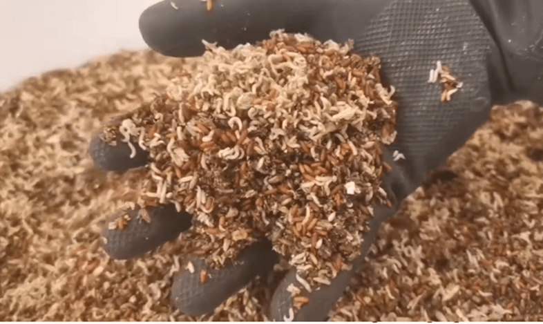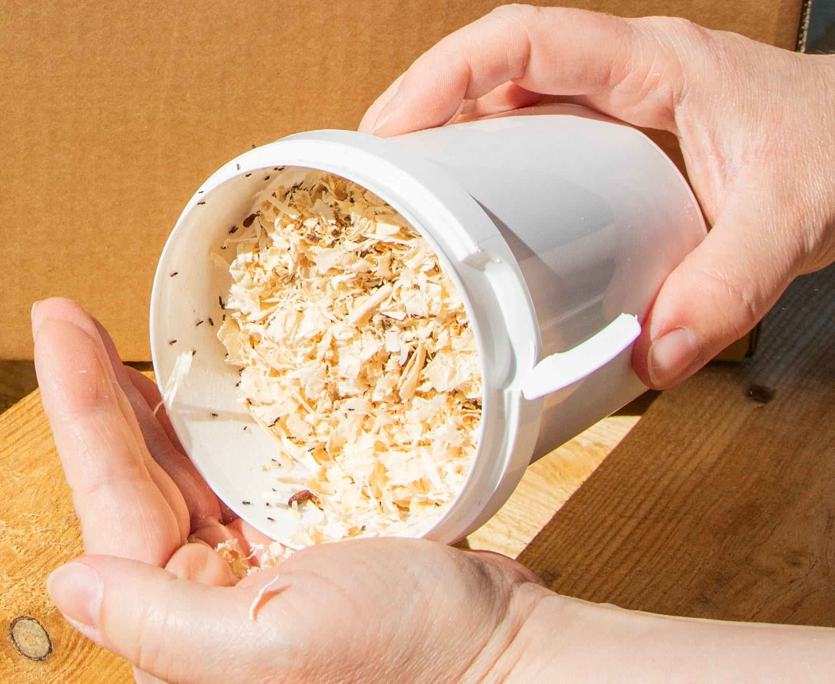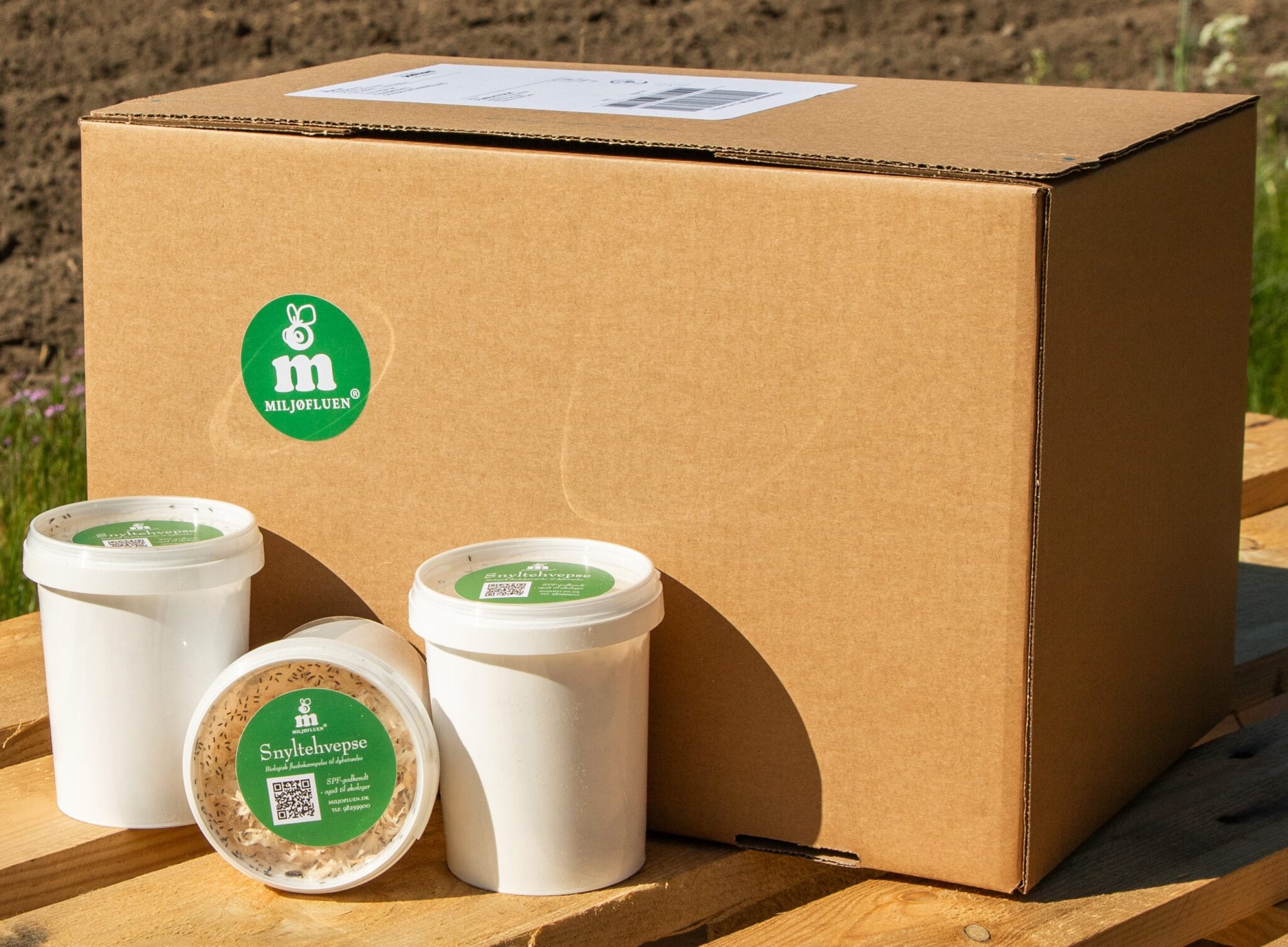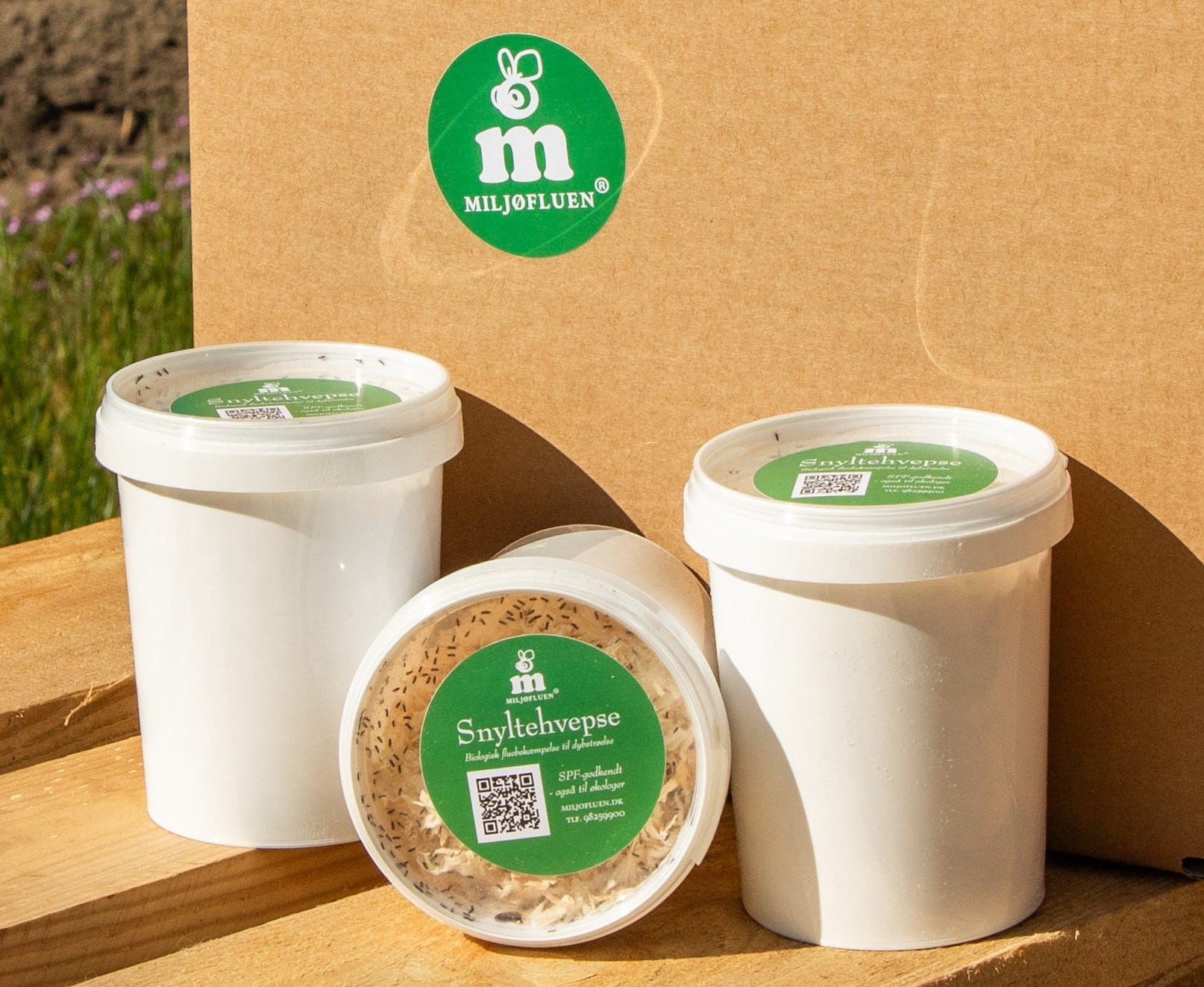 Snyltehvepsene pakkes i lufttætte bægre, som vi sender direkte ud til stalden.