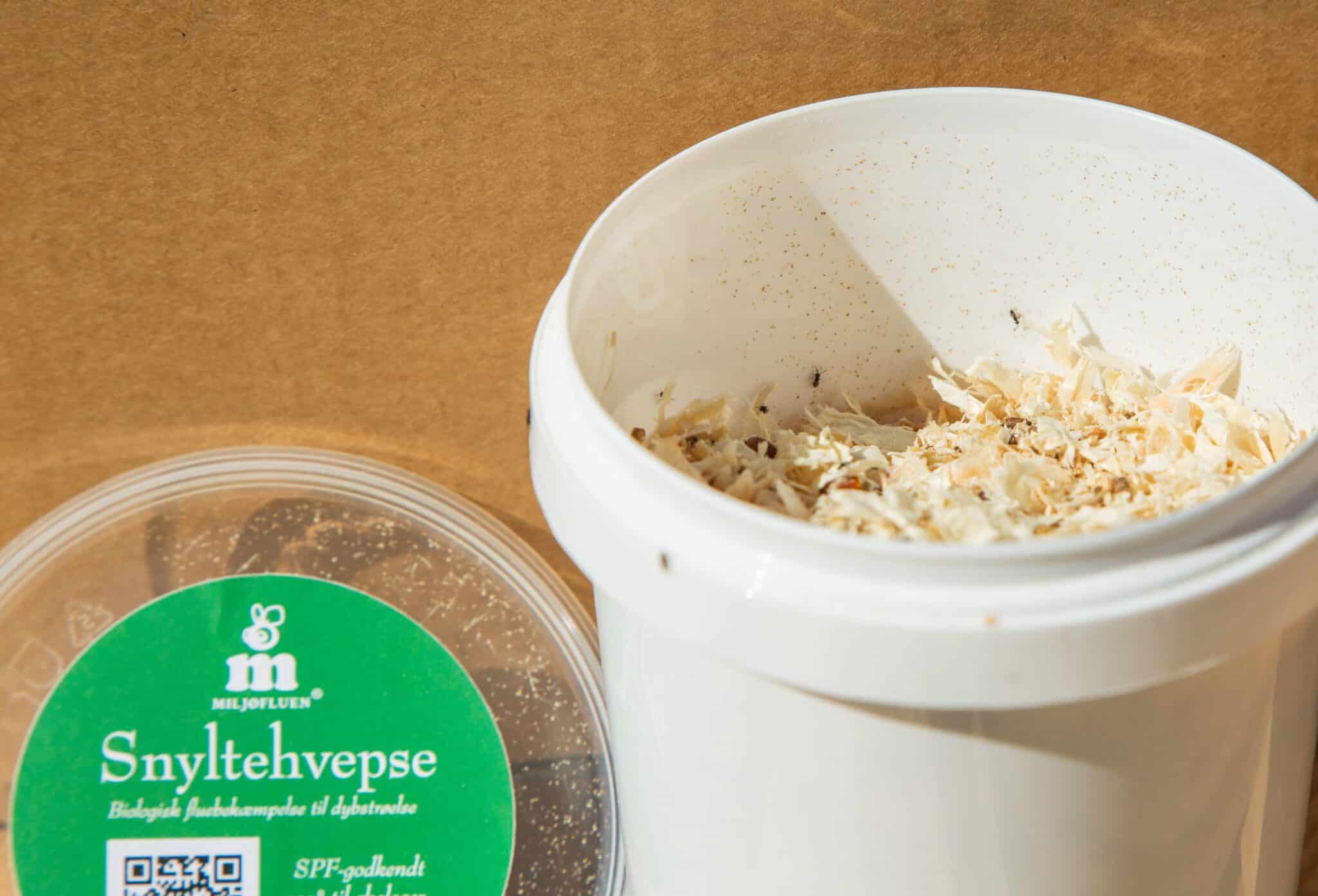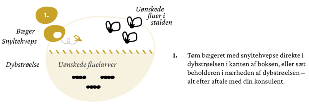 - Step 1. Snyltehvepse er velegnede til stalde med dybstrøelse, og de skal derfor ned i strøelsen for at finde de fluepupper, der indeholder uønskede fluer. Det kan man gøre på to måder.