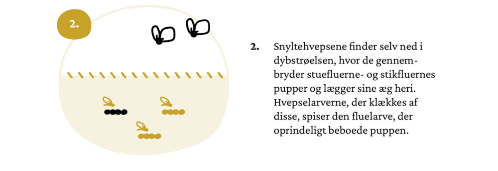 - Step 2. Når hvepsene er tilført stalden, så finder de selv ned i dybstrøelsen og går på jagt efter fluepupper, som de kan lægge deres æg i. Snyltehvepsens afkom lever af puppens indhold (fluelarven), mens den udvikler sig til voksen hveps.