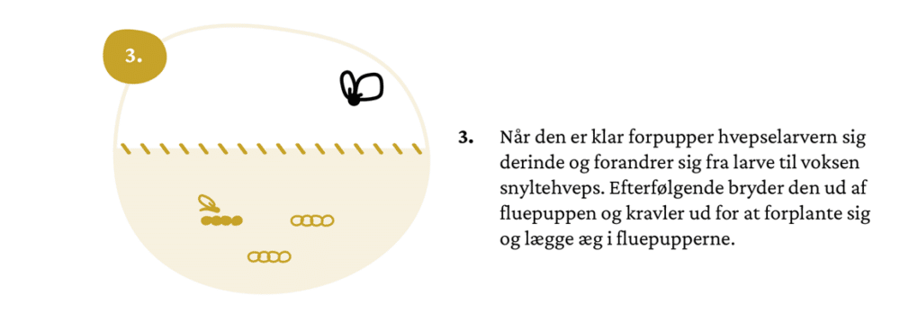 - Step 3: Af den parasiterede fluepuppe klækkes der hvepse og ikke fluer.