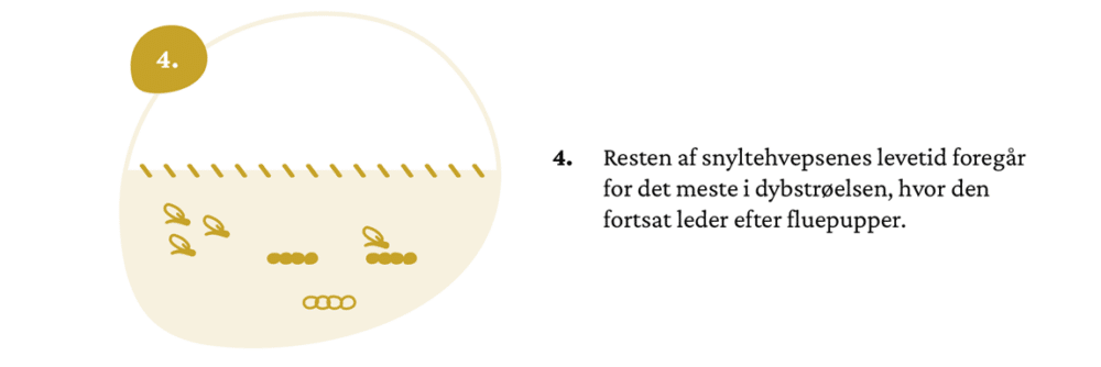- Step 4: Resten af den voksne snyltehveps’ levetid kravler den rundt i dybstrøelsen og leder efter fluepupper, den kan lægge æg i.